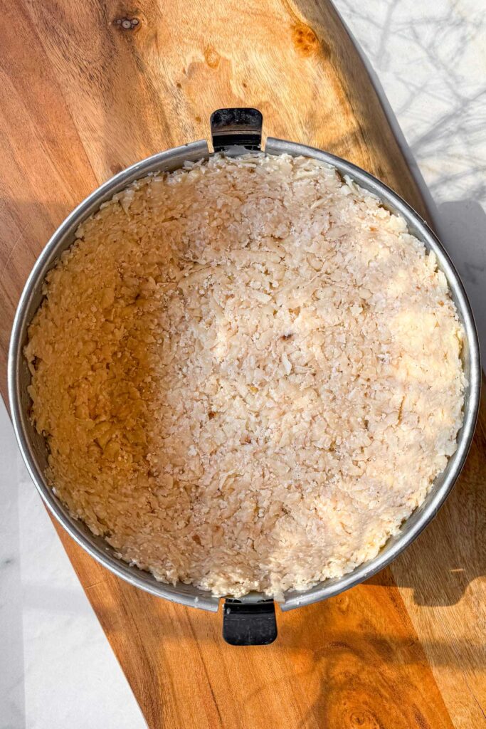 - Form The Crust: Press the potatoes firmly into the bottom of the springform pan and about 1 1/2 to 2 inches up the sides, keeping the crust about 1/4 inch thick.