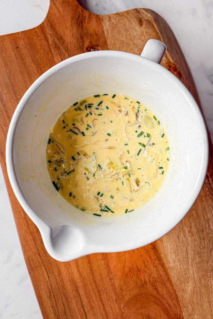 - Whisk The Custard: In a large bowl, whisk together the eggs, heavy cream, Dijon mustard, sea salt, and black pepper until smooth. Fold in the cooked leeks, chives, and half of the Gruyère cheese.