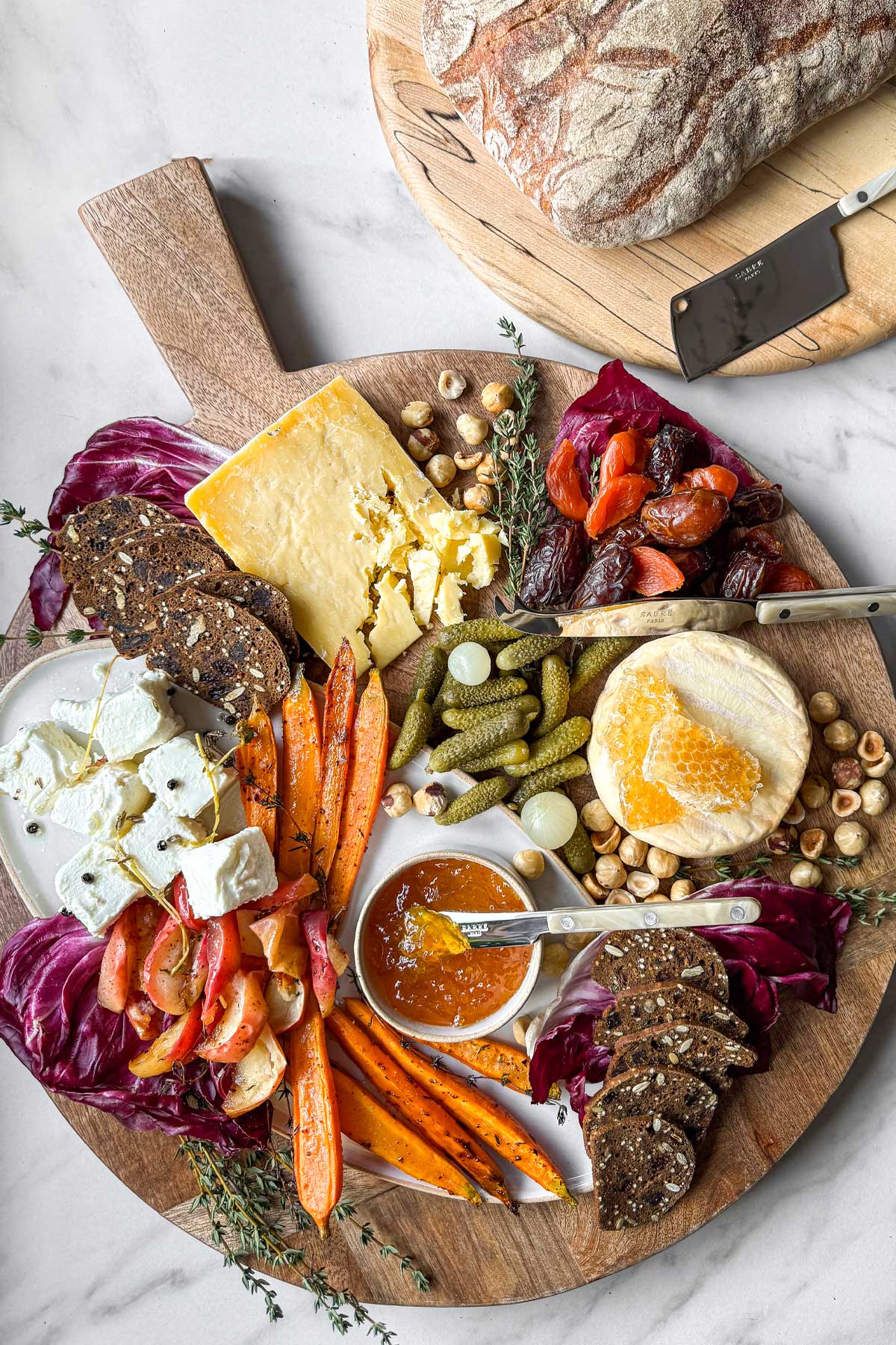 You can prep most elements up to a day ahead: toast nuts, wash herbs, and portion pickles and jam into bowls. You can roast the fruits and vegetables in advance as well, although bring them to room temperature or warmer before serving. Pull cheeses out 45–60 minutes before guests arrive and assemble the board 15–30 minutes before serving.
